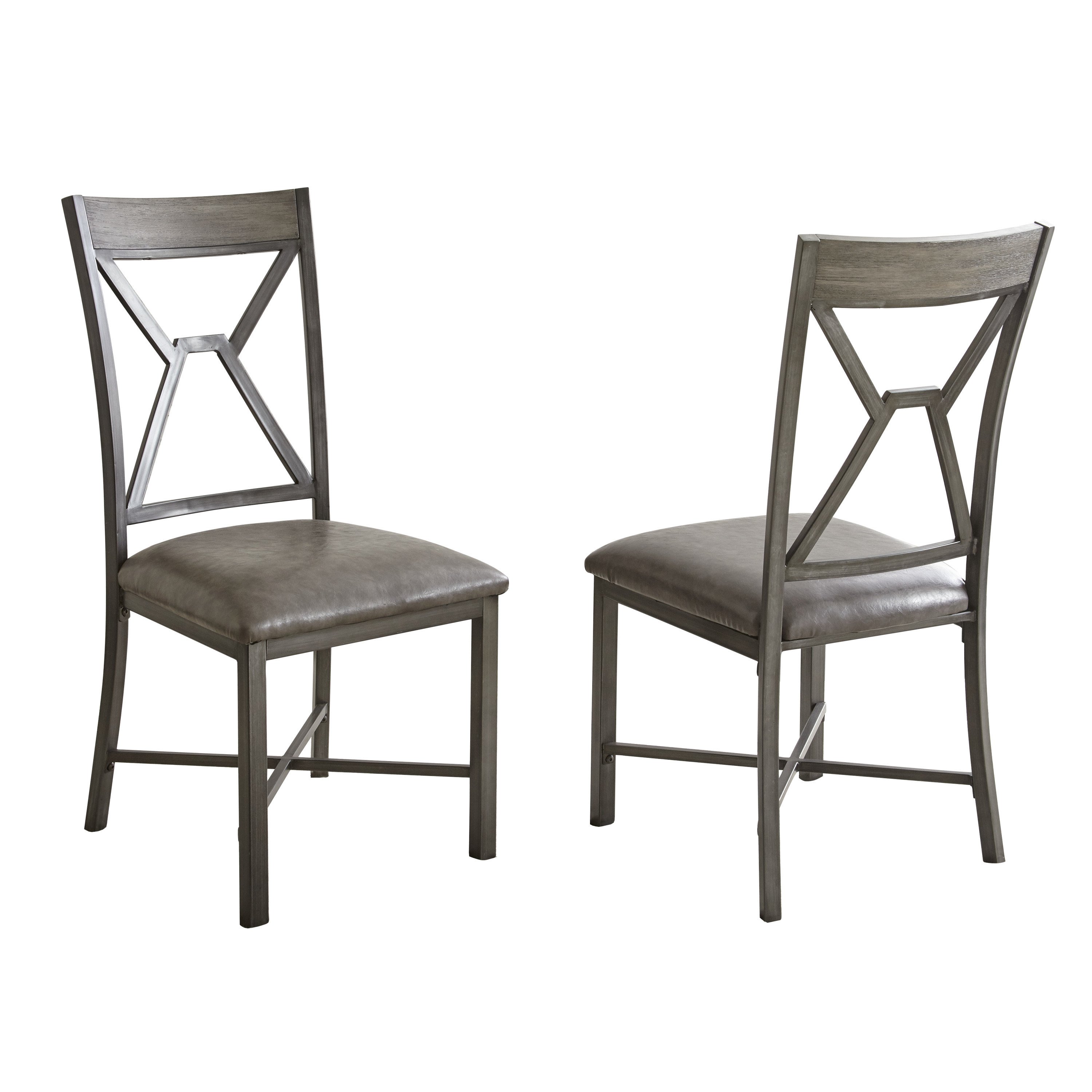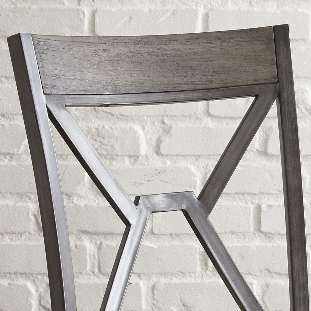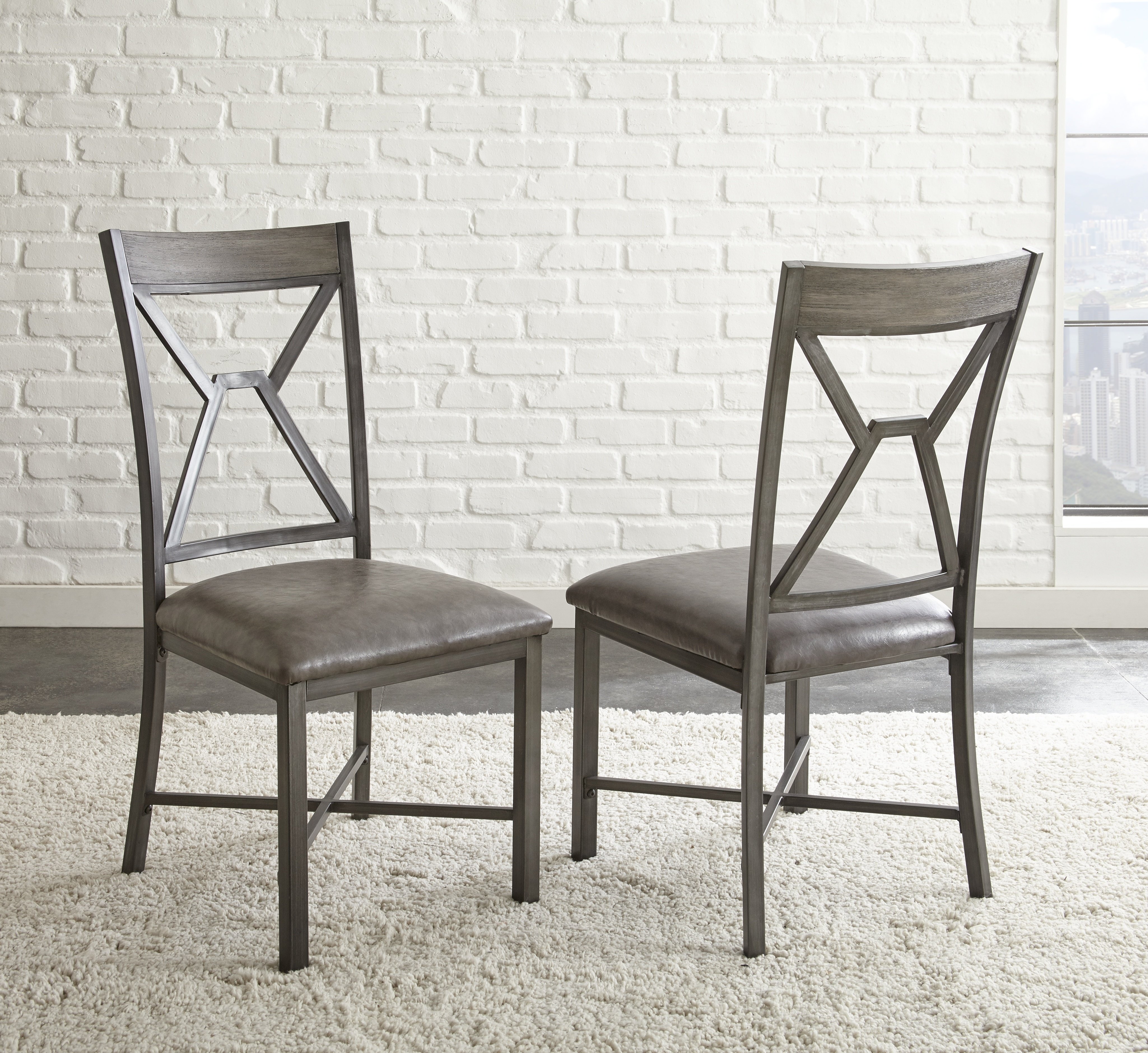 Comfortable upholstered polyurethane chairs feature geometric metal pattern in the back with wood-rimmed chair top