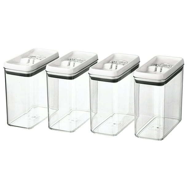 Keep your dry goods fresh with these Better Homes & Gardens Flip-Tite® Food Storage Containers. It is a handy item to have in your kitchen or pantry. These food storage containers are ideal for storing dry foods, such as pasta, dried beans, and candies. It's made without Bisphenol A (BPA) to ensure the safety of your food. A clear storage container makes it easy to identify the stored contents at a glance without having to label each canister. It features an easy-to-open flip buckle lid with food grade safe seal and is made of durable construction. This 4 pack set includes 4 of 11.5-cup rectangular container and 4 lids. Always wash before first use and remove seal from lid before wash. Allow all components to dry thoroughly before next use. Container and lid are dishwasher safe, and the silicone seal is hand wash. Not Microwave safe. Do not carry Flip-Tite Container by the lid.