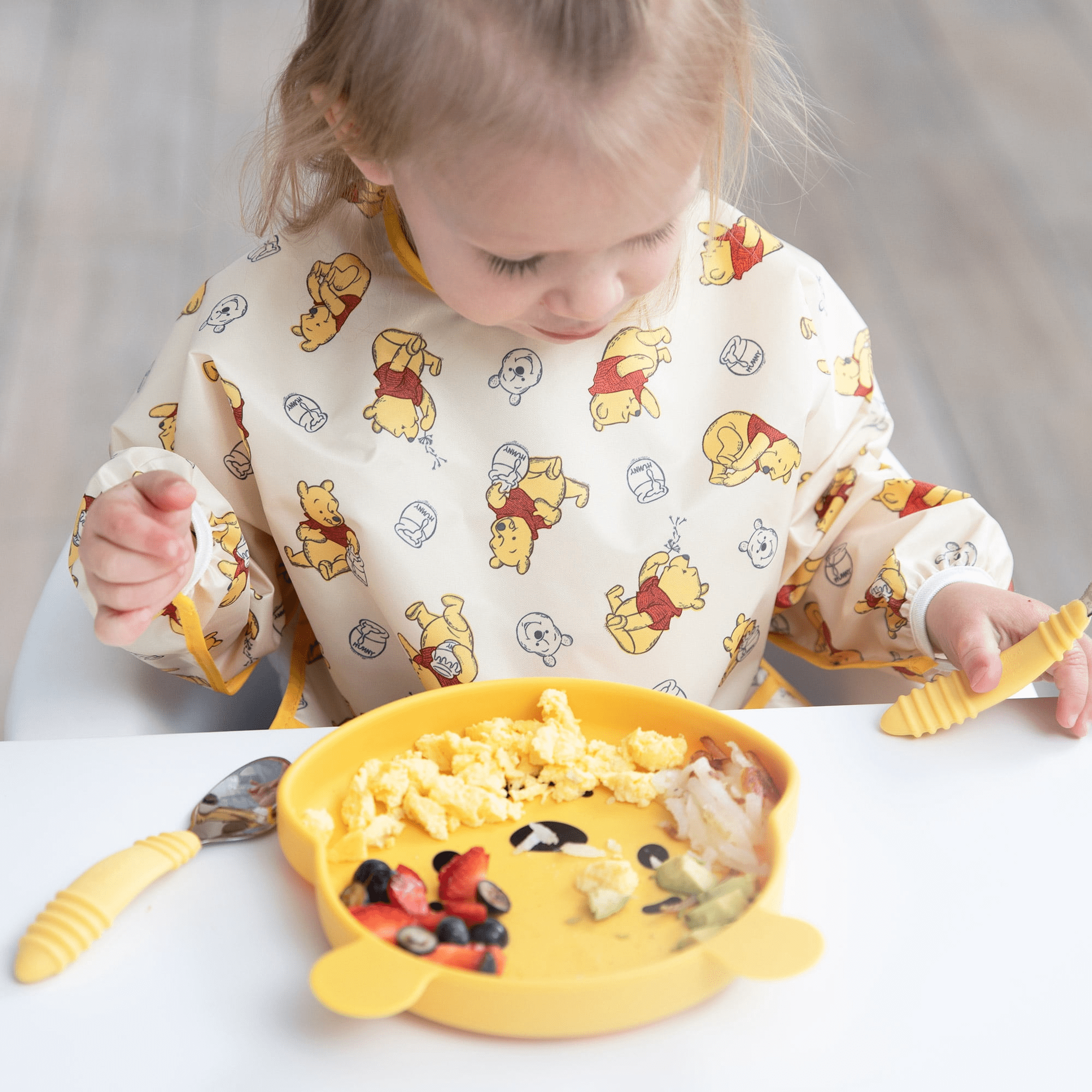 Little ones will love digging into mealtime with these pint-sized utensils. Stainless steel fork and spoon heads are designed for toddlers. The concave heads help keep food on the fork or spoon, promoting self-feeding with solid foods. The outer fork tines are curved to spear foods and keep food on the fork. Handles are textured 100% food-safe platinum silicone, so they’re easy-to-grip.