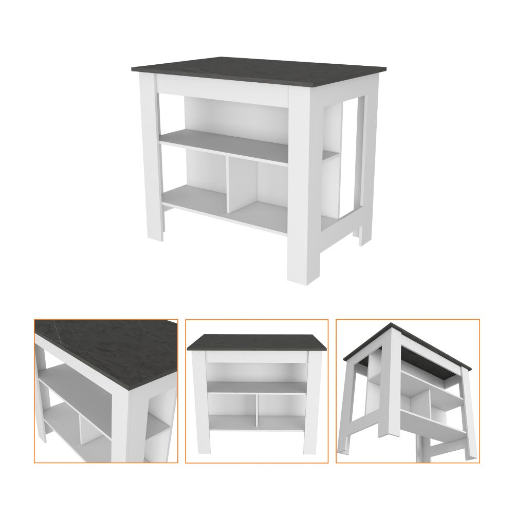 The kitchen island includes three low shelves with ample storage capacity, making it perfect for holding all of your kitchen essentials