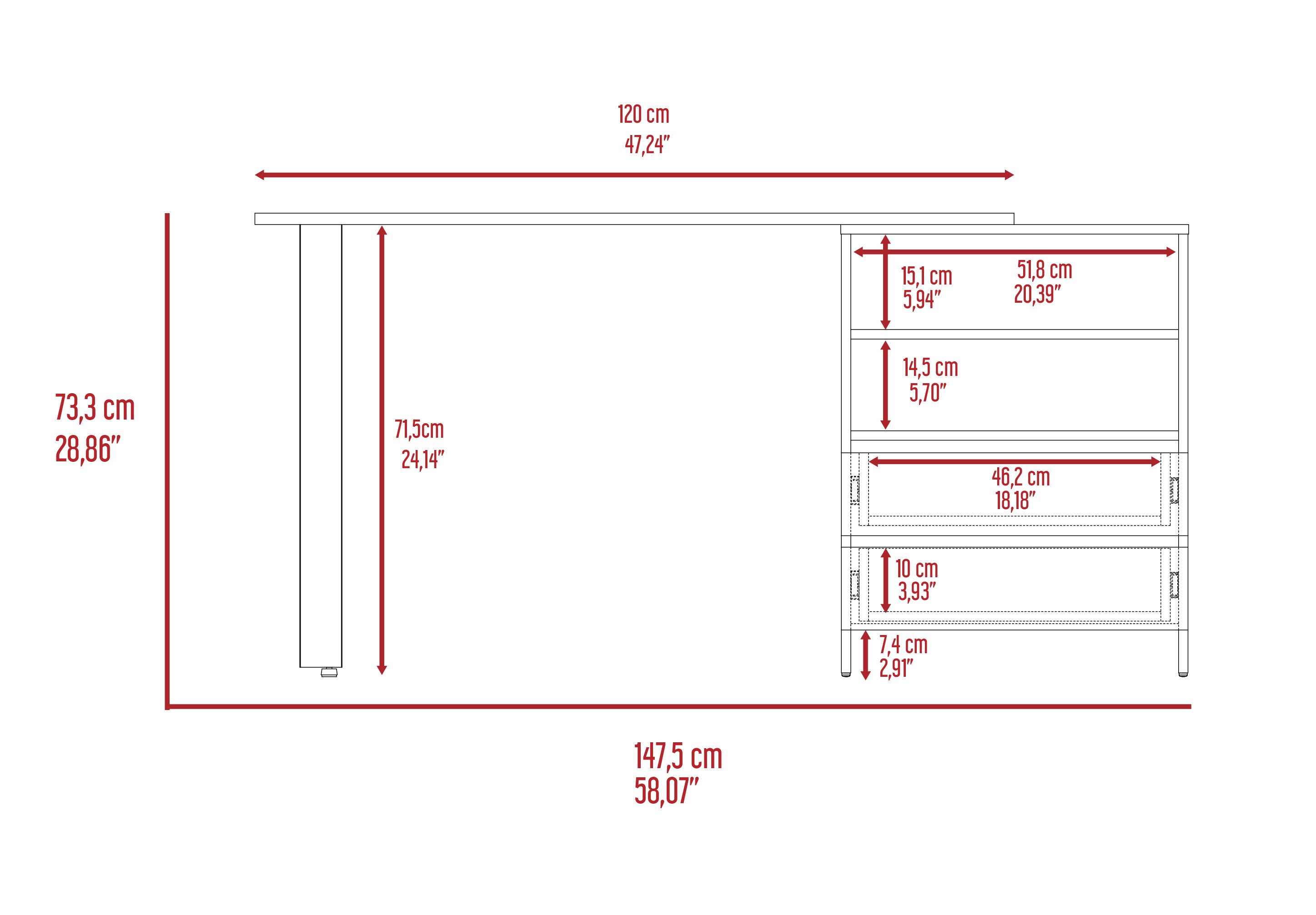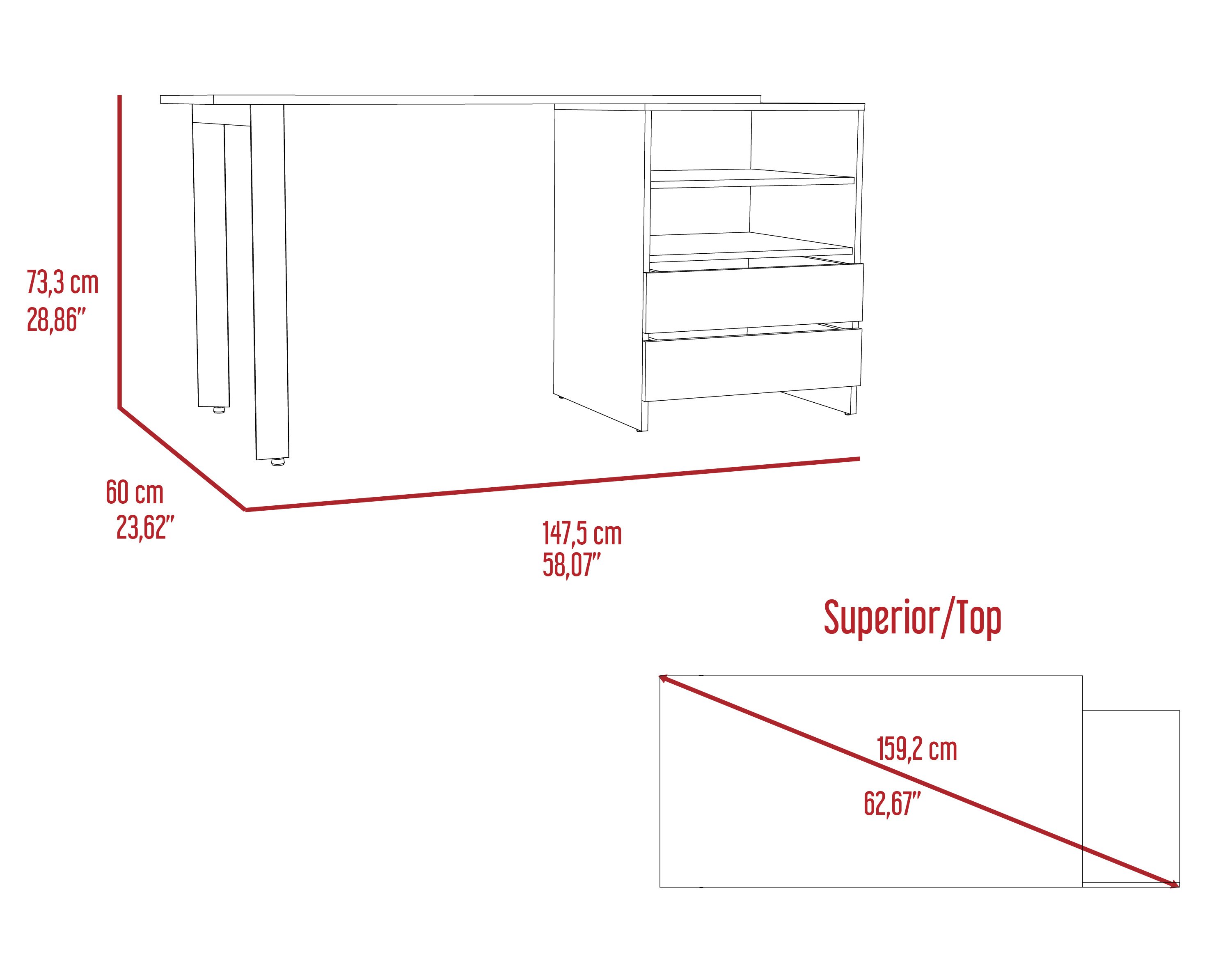 Romance CopyUpgrade your office space with this sleek, modern office desk. Featuring a light grey finish and ample storage space, this desk is elevated by bold, metal legs for an industrial-inspired vibe. It features two spacious drawers to store all your items, keep your space clean and neat, and two open shelves. A design that combines particleboard material with steel legs gives it a stylish and elegant touch.Product DetailsSet includesOne (1) writing deskDimensions28.86 inches high x 58.07 inches wide x 23.6 inches deepFinish ColorLight GreyMaterialsManufactured woodNumber of drawers2Number of shelves2