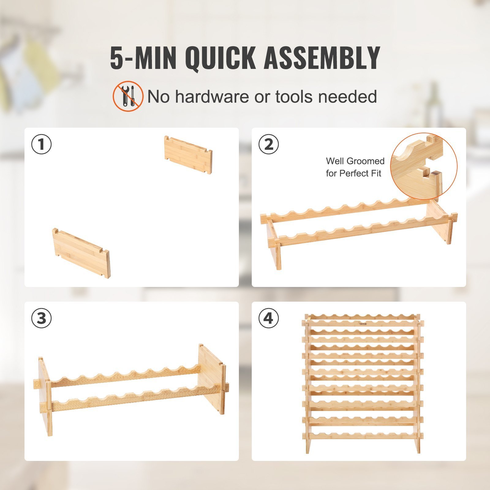 8-TIER STACKABLE WINE RACK" Our natural bamboo 8-tier wine rack is versatile and perfect for collectors. Use it in the kitchen, dining room, wine cellar, or bar, and stack it as desired. Entertain family and friends with your exceptional wine selection! Our floor wine rack has a wavy design that is customized for your wine bottles. Each partition has deep grooves that perfectly fit the bottle, preventing it from slipping. The sturdy natural bamboo has good toughness, which can perfectly support the wine bottle without swaying and allow it to be painted into different colors you like. Installing our bamboo wine rack is quick and easy, taking only 5 minutes without the need for tools or hardware. You can also stack up to the number of layers you like. You will have an elegant & classic wine storage rack to accent any kitchen, dining room, wine cellar, or restaurant.